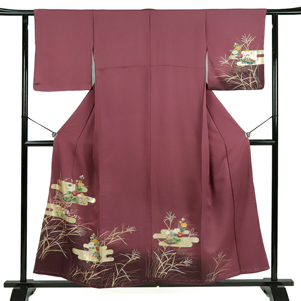 【 中古 】 訪問着 リサイクル 着物 フォーマル 新古品 正絹 仕立て上がり ぼかし 赤紫 臙脂 花 牡丹 桔梗 薄 萩 松 青海波 ヱ霞 箱 礼装用 結婚式 おしゃれ 身丈161cm 裄66.5cm Sサイズ No.3-0492